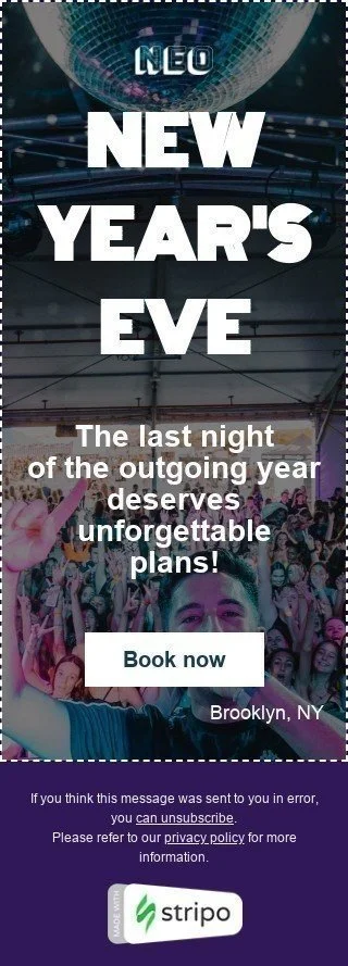 Ring in the new year with style and delicious food with our "New year's eve" email template for the restaurant industry. Perfect for promoting your restaurant's New Year's Eve celebration and special menu. The template features a festive and elegant design, with a clear message about the event details such as date, time, location, dress code, and other important information, including the menu options. The email includes a call-to-action button to encourage recipients to make reservations or learn more about the event. It is fully customizable, so you can easily add your branding and messaging. Make your restaurant the place to be for New Year's Eve by using our "New year's eve" email template.