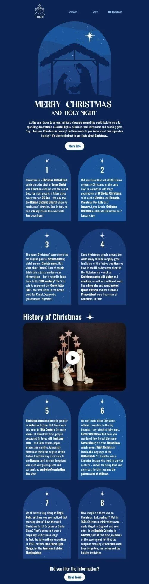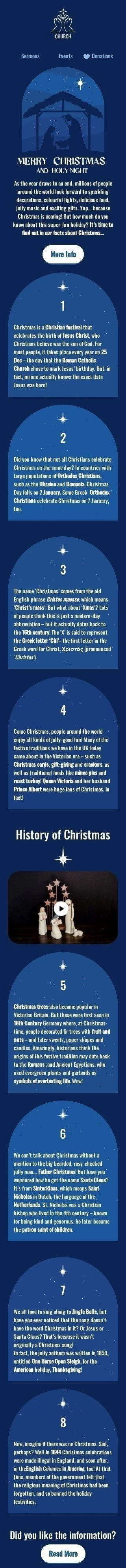 Experience the true spirit of Christmas with our "History of Christmas" promo email template designed for the church industry. This customizable template features a beautiful design that highlights the religious significance of the holiday season. Use this template to showcase your church's Christmas events and services, and offer exclusive deals to your subscribers. With a strong call-to-action button and visually appealing design, this email template is sure to engage your audience and spread the message of hope and peace. Don't miss the opportunity to celebrate the true meaning of Christmas and promote your church with our inspiring email template.