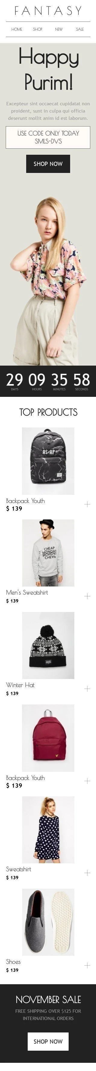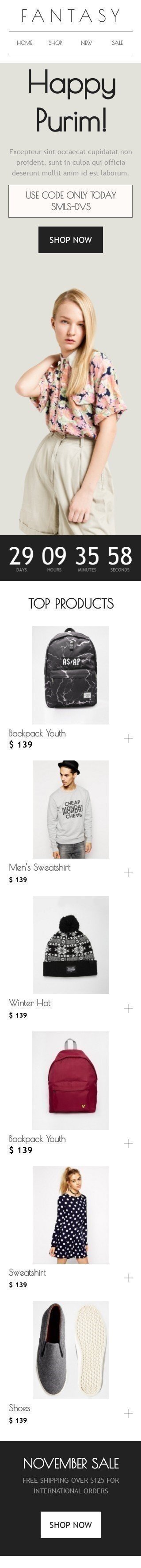 Celebrate Purim in style with our "Something Special" email template, perfect for the fashion industry. This template is designed to showcase your latest fashion collections and special deals. It features high-quality images of fashion items, along with a call-to-action button to make it easy for customers to shop. The template has a modern and chic design that can be easily customized to match your brand's aesthetic. Use it to promote your fashion collections and offer something special to your customers this Purim.