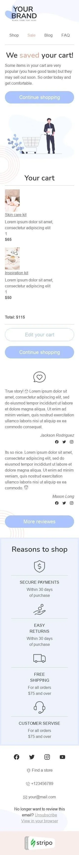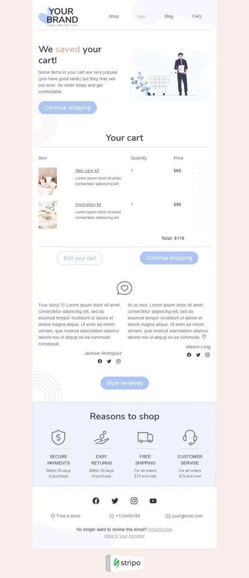 Looking to give your customers a nudge in the right direction? Meet the Email Template "Saved cart" for Fashion industry – your very own powerful retargeting tool.The "Saved cart" Email Template comes with a clean and modern design that is guaranteed to stand out in your customers' inboxes. It is also fully responsive and will adapt to any screen size, making it perfect for viewing on any device. Ready to start driving more sales? Then grab the "Saved cart" Email Template for Fashion industry today!