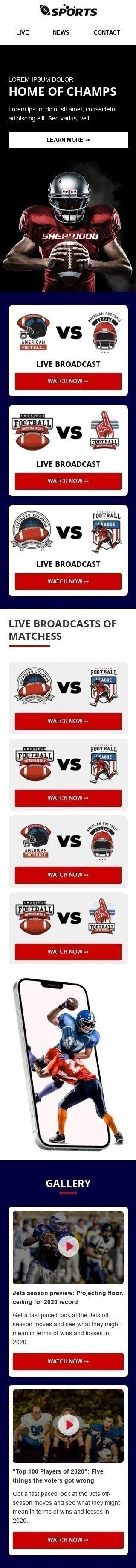 Get ready for the big game with our "Broadcast Week" Super Bowl Email Template for the Sports industry! This template is perfect for promoting your Super Bowl events or merchandise. With a sporty design and dynamic language, this template effectively communicates all the important details and captures the excitement of the event. The clear message and eye-catching imagery will get your subscribers pumped for the big game and increase attendance or sales. Use this template to make your Super Bowl celebration a touchdown! Ideal for sports bars, merchandise retailers, and fans.