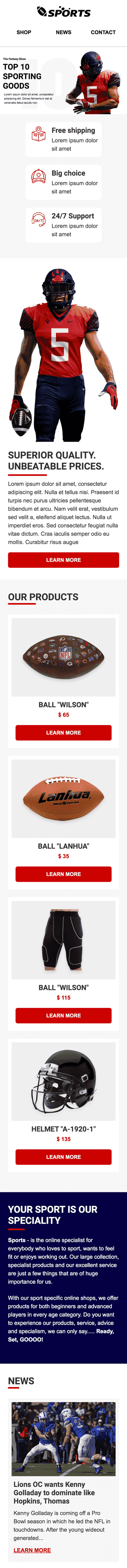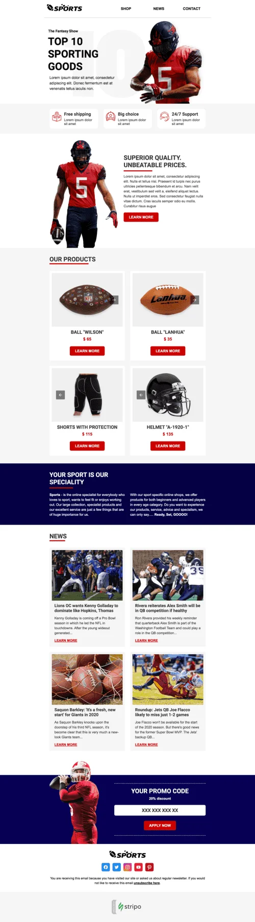Celebrate the biggest event in sports with our Super Bowl Email Template "Games Time" for the Sports industry. This template features a dynamic design and lively language, capturing the excitement and energy of the Super Bowl. With clear calls-to-action and space for promotions, this template is sure to get your customers fired up and ready for the big game. Customize it with your team's colors, logos, and messaging to build brand loyalty and drive sales. Ideal for sports retailers, ticket sellers, and sports bars.