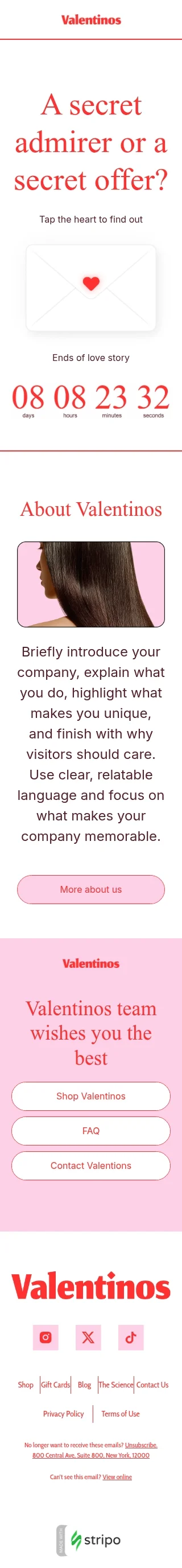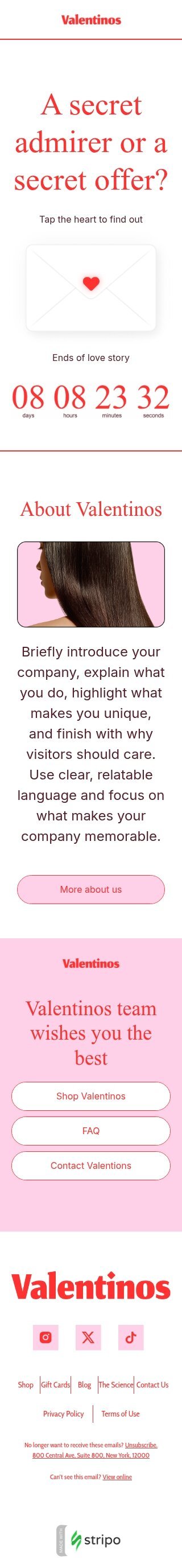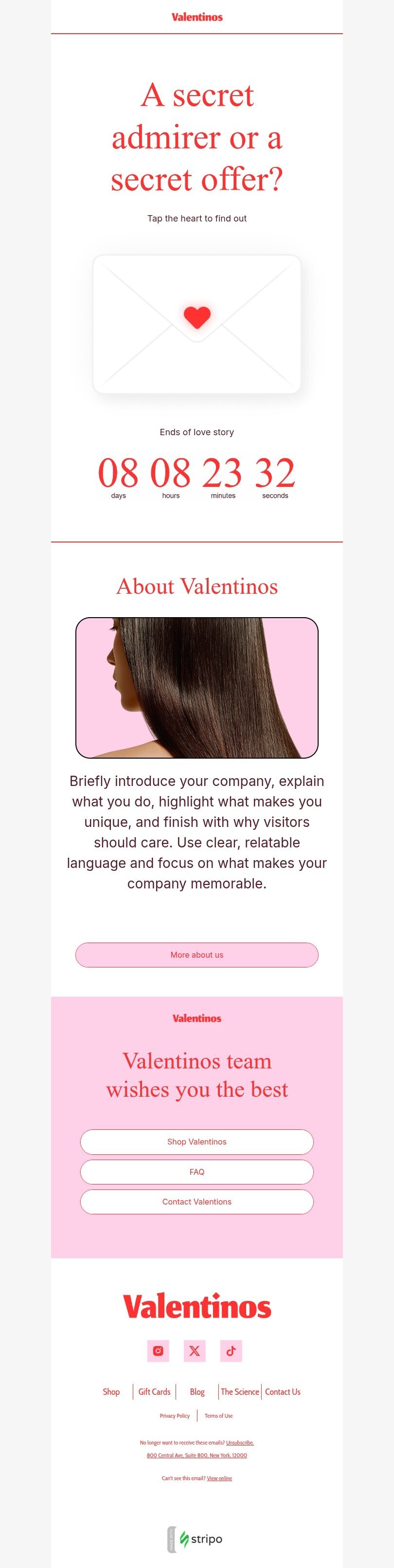Spark curiosity and excitement with our "Tap the Heart to Find Out" Valentine’s Day email template, designed for the ecommerce industry. Featuring a playful, interactive heart-shaped button, this template invites recipients to engage with your special offers and hidden deals. Perfect for creating a sense of mystery and fun, it encourages customers to explore your Valentine’s Day promotions, exclusive discounts, or curated gift ideas. With its festive design, bold CTAs, and eye-catching visuals, this template is guaranteed to boost customer engagement and drive sales during the love-filled season!