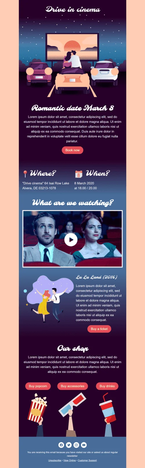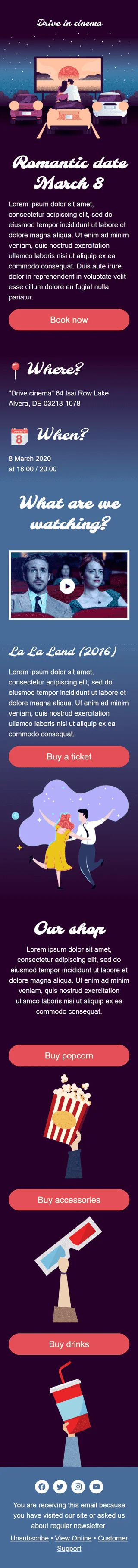 Celebrate Women's Day in style with our "Car Cinema" Email Template, designed for movie buffs. This template features a fun and feminine design, perfect for showcasing your special Women's Day deals and promotions. Customize it with your branding and messaging to engage your audience and boost sales. Use this opportunity to help your customers celebrate Women's Day with their loved ones by enjoying the latest blockbuster movies at home. Don't miss out on the chance to increase customer loyalty and sales with our "Car Cinema" Email Template.
