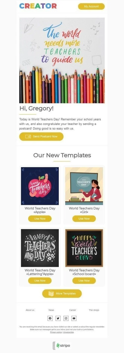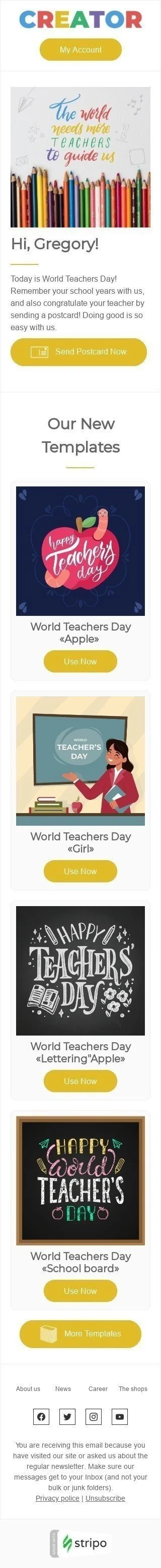Recognize the hard work of our educators with our "Creator" Email Template, designed exclusively for the Design industry. This fully customizable template features colorful and inspiring images of creative tools and designs that showcase the creativity and talent of teachers. Use this email to promote your design services or products that cater to the needs of educators, or to simply express gratitude and appreciation for the impact they have on our lives. Increase your business's visibility and engage with your subscribers with this heartfelt and thoughtful email, which celebrates the important role of teachers in shaping our world. Celebrate World Teachers' Day with our "Creator" Email Template.