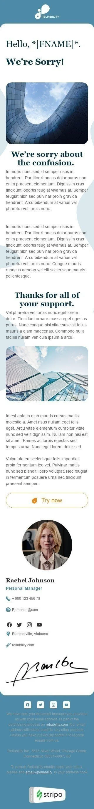 Під час проведення вебінару або організації заходу іноді все йде не за планом. Ось чому ми дуже раді представити шаблон листа з вибаченнями «Нам шкода» для ринку вебінарів! Наш шаблон пропонує простий, але щирий, спосіб спокутати свою провину перед аудиторією і показати, що ви серйозно ставитеся до чужого часу і лояльності. З цим шаблоном в арсеналі вибачення за помилки та недоліки стануть безболісними та необтяжливими. Шаблон листа з вибаченнями «Нам шкода» дає змогу щиро вибачитися без зайвого клопоту і запам'ятатися, залишаючи гарне враження у клієнтів кожного разу.