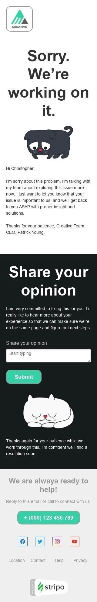 Коли виникають помилки, потрібно вміти швидко та ефективно вибачитися. Саме тому ми створили шаблон листа з вибаченнями «Ми працюємо над цим» для сфери дизайну. За допомогою цього шаблону можна надіслати професійного та щирого листа з вибаченнями своїм клієнтам або замовникам за будь-яку помилку, що сталася. Чи то порушення дедлайну, чи то неякісний дизайн, чи щось іще, такий шаблон допоможе вам узяти на себе відповідальність і виправити ситуацію. З шаблоном листа з вибаченнями «Ми працюємо над цим» для індустрії дизайну можна показати, що ви маєте у своєму розпорядженні швидкий і простий спосіб впоратися з будь-якими казусами в обслуговуванні клієнтів. Замовте зараз і будьте готові до всього!
