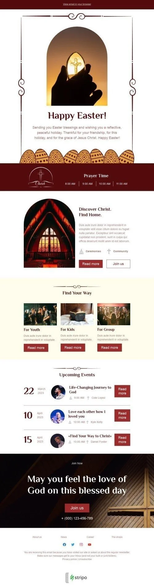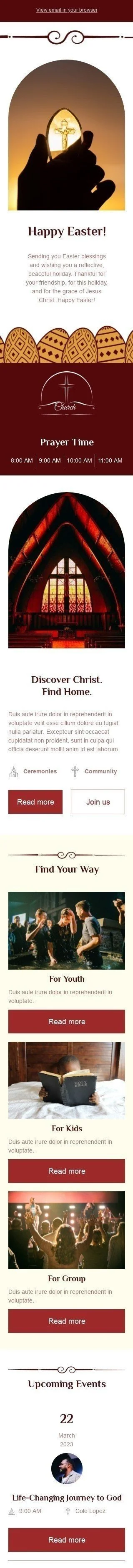 Introducing our "Find Your Way" Easter email template, designed for the church industry. This customizable template features a beautiful design that captures the essence of Easter and invites subscribers to join in the celebrations. Use this template to promote your Easter services, share inspiring messages, and encourage subscribers to reflect on the meaning of the holiday. With a strong call-to-action button and visually appealing design, this email template is sure to drive engagement and increase attendance at your Easter events. Don't miss the chance to connect with your congregation and spread the joy of Easter through our engaging email template.