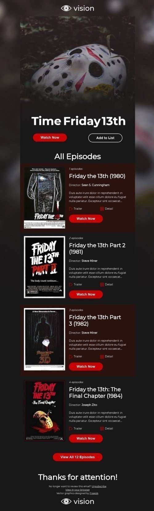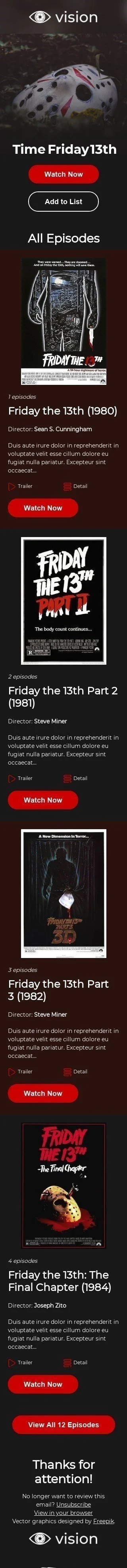 П'ятницю 13-те з нашим "Часом для П'ятниці 13-те" шаблоном електронної пошти, розробленим виключно для індустрії кіно. Ця електронна пошта містить нашу останню колекцію класичних фільмів жахів, які ідеально підходять для моторошного марафону фільмів у П'ятницю 13-те. Шаблон повністю налаштовуваний і включає зображення наших страшних рекомендацій фільмів, а також повідомлення, яке заохочує клієнтів раніше зануритися в атмосферу Хелловіну. Ідеально підходить для просування ваших спеціальних пропозицій на П'ятницю 13-те, ця електронна пошта збільшить залученість клієнтів