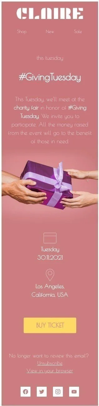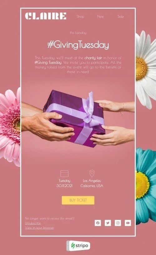 Приєднуйтесь до руху Giving Tuesday та зробіть різницю з нашим "Ярмарком благодійності" шаблоном електронної пошти для Giving Tuesday, спеціально розробленим для індустрії моди. Завдяки елегантному та вишуканому дизайну, цей шаблон дозволяє вам просувати ваші благодійні зусилля та демонструвати ваші останні колекції моди. Налаштуйте його під власний брендинг та повідомлення, щоб підкреслити ваші конкретні акції збору коштів та промоції. Заохочуйте своїх клієнтів купувати заради справи та підтримувати вашого благодійного партнера. Зробіть вплив і збільшіть залученість клієнтів з нашим "Ярмарком благодійності" шаблоном електронної пошти для Giving Tuesday.