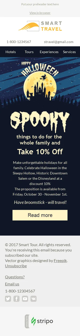Шаблон "Незабутні тури" Halloween email ідеально підходить для туристичної індустрії. Завдяки своєму моторошному, але запрошуючому дизайну, він дозволяє вам продемонструвати ваші ексклюзивні пропозиції та пакети подорожей на тему Хелловіну для сезону страху. Чи то ви рекламуєте екскурсію по місту з привидами, чи підкреслюєте особливий досвід Хелловіну, цей шаблон допоможе вам привернути увагу вашої аудиторії та стимулювати бронювання. Завдяки налаштовуваним елементам і сильним закликам до дії, ви можете створити кампанію, яка виділяється і заохочує ваших клієнтів скористатися вашими унікальними пропозиціями подорожей на Хелловін.
