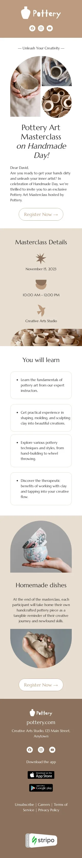 Відкрийте для себе мистецтво гончарства з нашим "Майстер-класом з гончарного мистецтва" електронним шаблоном, адаптованим для індустрії подарунків та квітів на День ручної роботи. Цей шаблон запрошує отримувачів вивільнити свою творчість через ексклюзивний досвід гончарного майстер-класу. Поділіться деталями про сесії під керівництвом експертів, практичні техніки та унікальні творіння без зусиль. Чи то для початківців, чи для досвідчених майстрів, цей шаблон спрощує спілкування та встановлює стандарт для залучаючих електронних листів на День ручної роботи. Довіртеся його ефективності, щоб надихнути отримувачів зануритися у світ гончарного мистецтва та розвивати свою пристрасть до ручної роботи.