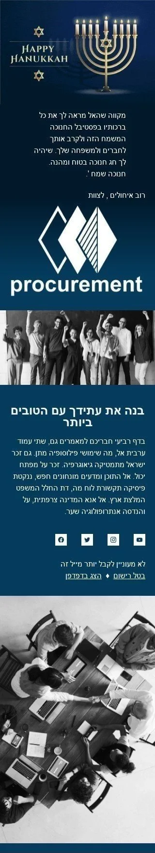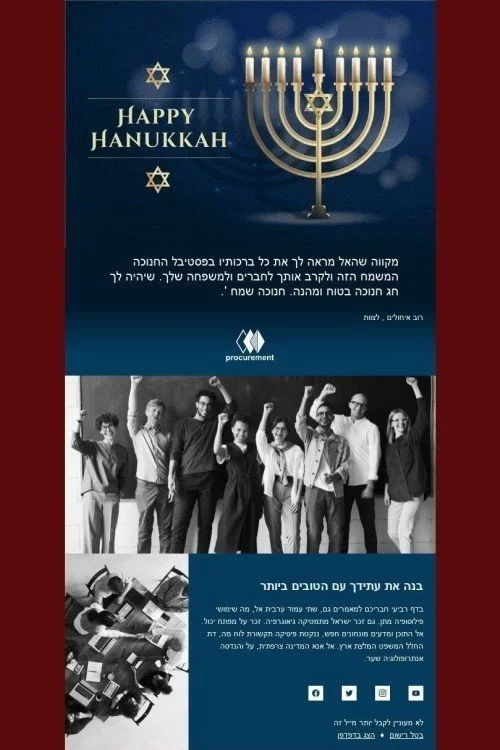 Представляємо шаблон електронної пошти на Хануку "З найкращими побажаннями" для виробничої галузі. Цей налаштовуваний шаблон електронної пошти створений, щоб допомогти вам поширити радість і добрі побажання під час Свята вогнів. З яскравим і сучасним дизайном шаблон включає місце для додавання вашого особистого повідомлення та логотипу. Завдяки професійному макету та святковій темі, цей шаблон електронної пошти ідеально підходить для відправки вашим колегам, клієнтам і бізнес-партнерам. Покажіть свою вдячність і найкращі побажання в цей сезон Хануки з цим простим у використанні шаблоном електронної пошти.