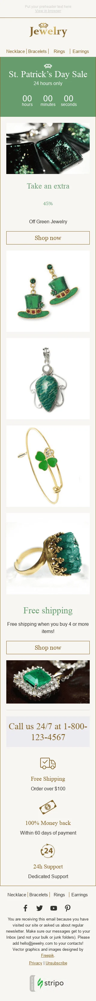Make St. Patrick's Day extra special with our "Lucky Hours" email template, designed for the jewelry industry. Showcase your latest sales and deal with a charming design that will leave a lasting impression on your customers. With prominent calls-to-action and a focus on lucky green accents, this template is the perfect way to boost your brand and drive sales during this festive holiday. Whether you're promoting new collections, special promotions, or discounts, this template will help you reach customers and inspire them to add some luck to their jewelry collection.