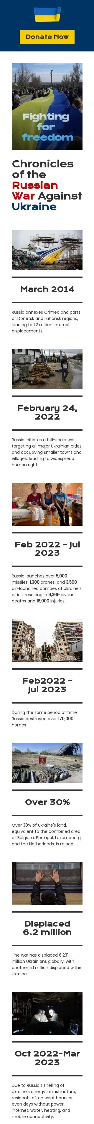 Освітліть правду з нашим "Числа про повномасштабну війну Росії в Україні" шаблоном електронної пошти, розробленим для індустрії Без Війни. Цей шаблон представляє переконливу візуальну наративу агресії Росії, ділячись ключовою статистикою, яка викриває руйнування, спричинені конфліктом. Налаштовуваний контент дозволяє вам персоналізувати повідомлення, підвищуючи обізнаність про терміновість миру. Використовуйте цей шаблон, щоб об'єднати підтримку, спонукати до дій і закликати до припинення насильства. Зробіть потужний вплив у боротьбі за мир і справедливість з шаблоном електронної пошти "Числа про повномасштабну війну Росії в Україні".