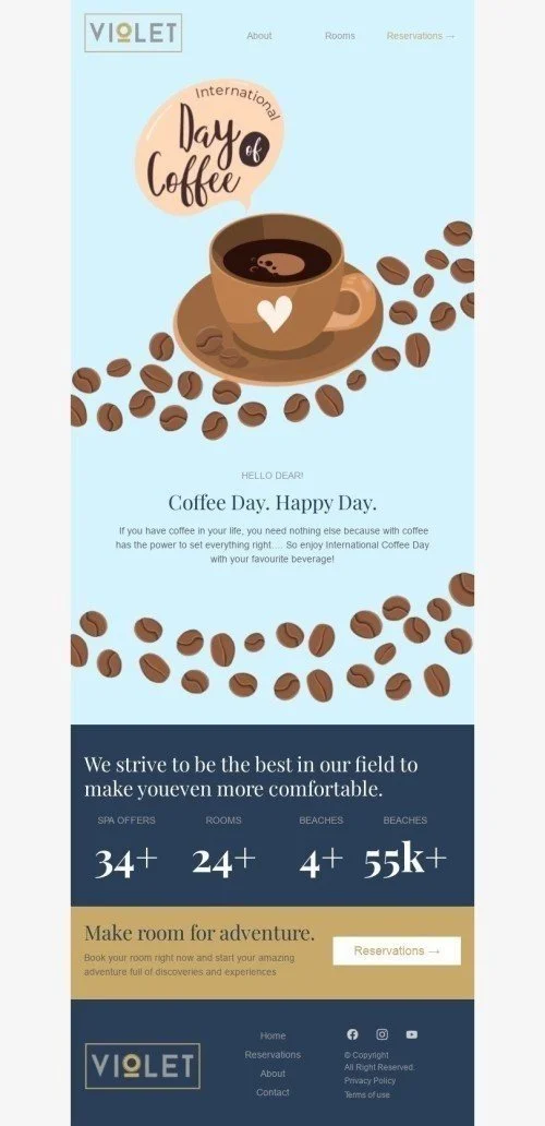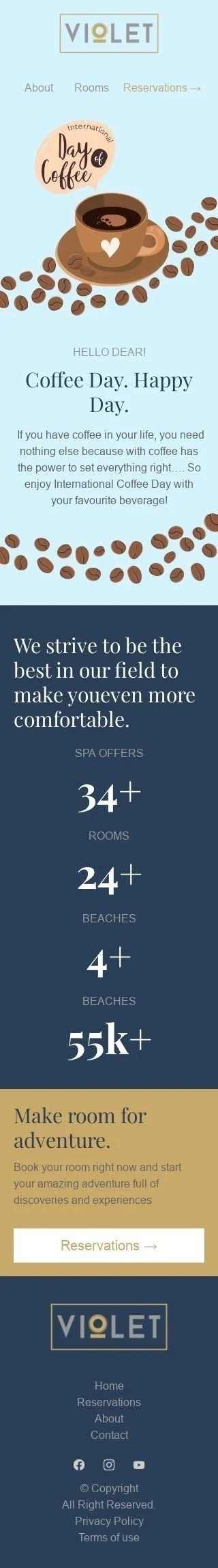Відзначте Міжнародний день кави з нашим "Щасливим днем кави" шаблоном електронної пошти, адаптованим для готельної індустрії. Цей настроюваний шаблон має чарівний дизайн з зображеннями димлячих чашок кави, які, безсумнівно, змусить ваших підписників захотіти свіжої кави. Використовуйте цей шаблон, щоб підкреслити унікальні кавові пропозиції вашого готелю та просувати ваше кафе або ресторан. З потужною кнопкою заклику до дії та привабливим макетом, цей шаблон електронної пошти стимулюватиме залучення та продажі для вашого бізнесу. Не пропустіть можливість надіслати свої теплі побажання підписникам і збільшити дохід вашого готелю.