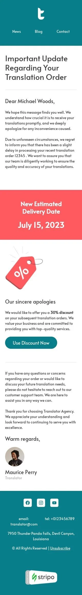 Наш шаблон електронного листа підтвердження замовлення "Важливе оновлення" є важливим інструментом у галузі перекладів. Він дозволяє вам ефективно повідомляти про суттєві зміни або оновлення щодо проекту перекладу клієнта. Завдяки чіткому та професійному дизайну, налаштовуваному контенту та можливостям для вкладення, цей шаблон забезпечує своєчасне інформування ваших клієнтів та доступ до переглянутого матеріалу або інструкцій. Не пропустіть можливість підтримувати прозорість і покращувати відносини з клієнтами, використовуючи наш ефективний і впливовий шаблон електронного листа. Тримайте своїх клієнтів в курсі та підтримуйте професіоналізм у кожному спілкуванні, забезпечуючи успішні результати проекту.