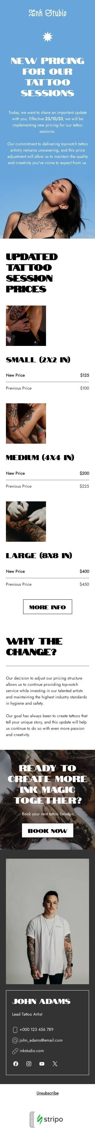 Шаблон листа «Нові ціни на наші сеанси татуювання» тематики прайс-лист для тату-індустрії