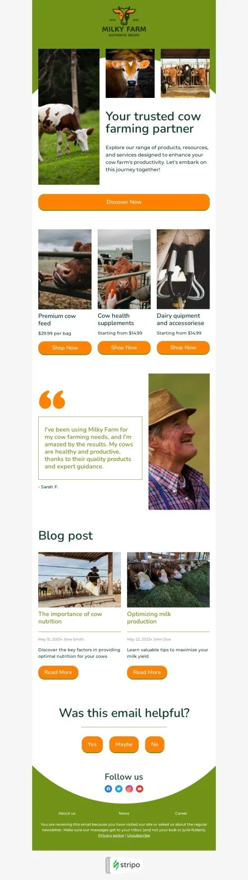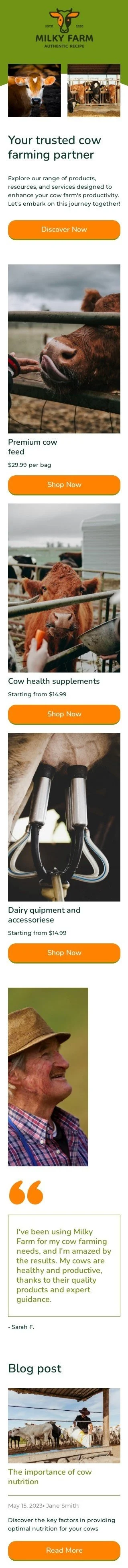Наш "Ваш надійний партнер у молочному скотарстві" promo email шаблон є ідеальним інструментом для бізнесу в аграрній галузі, який прагне просувати свої послуги серед молочників. Шаблон має візуально привабливий дизайн, який демонструє нашу експертизу та зобов'язання підтримувати фермерів у їхніх зусиллях у молочному скотарстві. Завдяки налаштовуваному контенту та чіткому заклику до дії, цей електронний лист заохочує отримувачів дослідити переваги партнерства з нами для їхніх потреб у молочному скотарстві. Не пропустіть можливість зарекомендувати себе як надійного партнера для молочників з нашим професійним та впливовим promo email шаблоном.