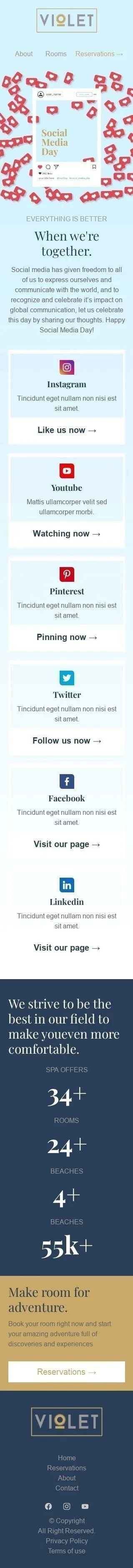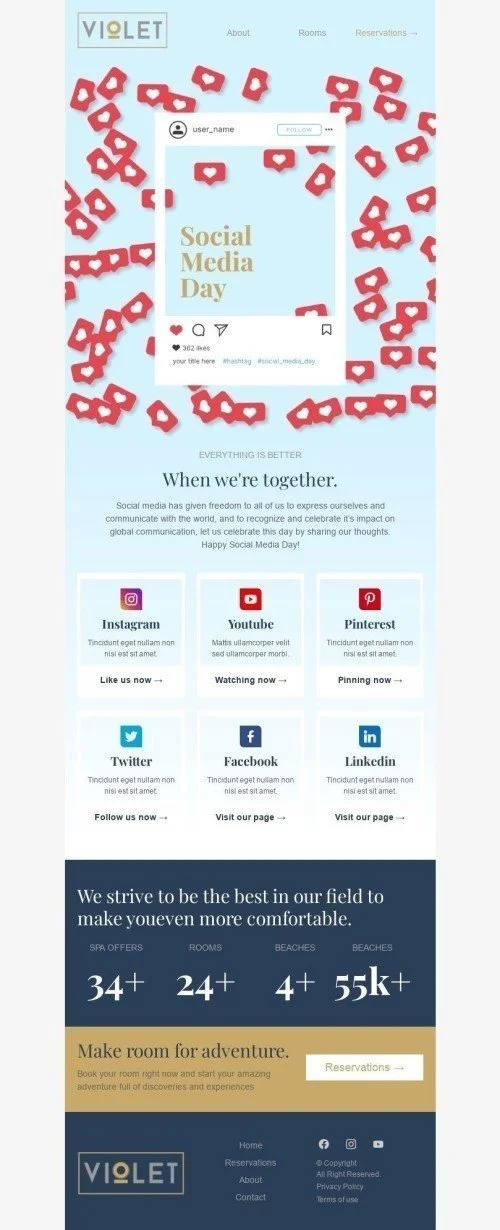 Приєднуйтесь до нас у святкуванні Дня соціальних медіа з нашим "Коли ми разом" шаблоном електронної пошти, спеціально розробленим для індустрії готелів. Цей налаштовуваний шаблон має теплий і запрошуючий дизайн, який заохочує підписників ділитися своїми незабутніми готельними враженнями в соціальних мережах. Використовуйте цей шаблон, щоб продемонструвати зручності вашого готелю та запропонувати ексклюзивні знижки вашим підписникам у соціальних мережах. Завдяки сильній кнопці заклику до дії та візуально привабливому дизайну, цей шаблон електронної пошти обов'язково підвищить залученість і збільшить вашу присутність у соціальних мережах. Не пропустіть цю можливість відсвяткувати День соціальних медіа та просунути ваш готель з нашим інтерактивним шаблоном електронної пошти.