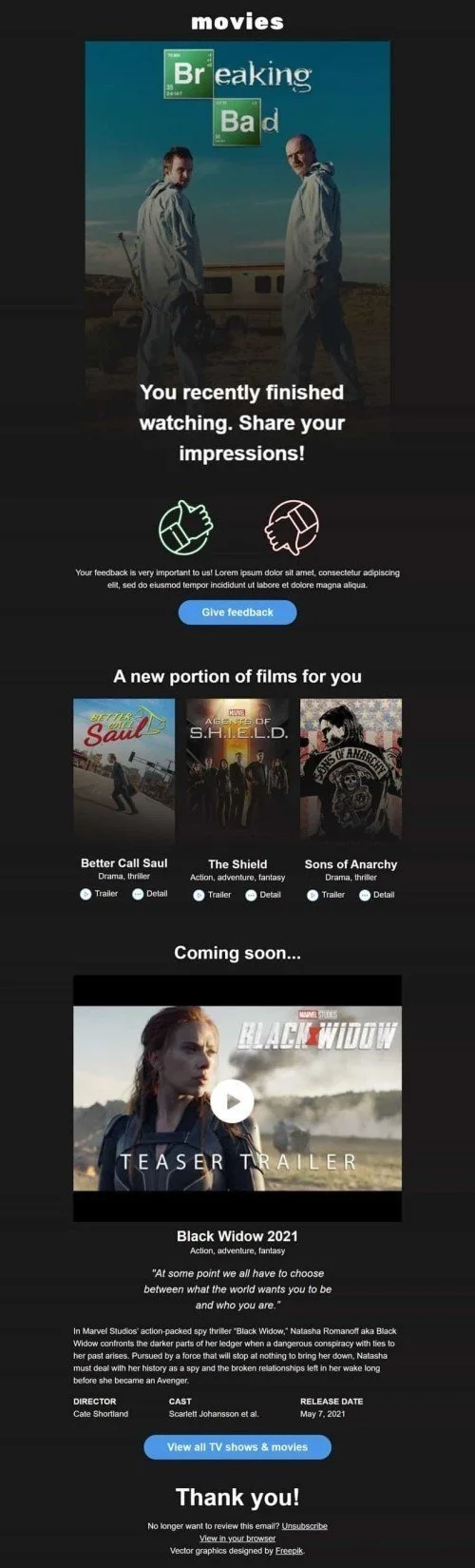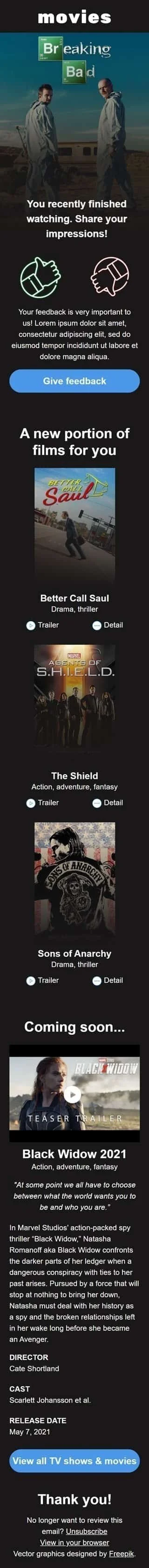 Шукаєте, як отримати цінні відгуки про ваші останні фільми? Не шукайте далі, ніж опитування "Поділіться своїми враженнями" та шаблон електронного листа для зворотного зв'язку, розроблений для індустрії кіно. Цей налаштовуваний шаблон спрощує збір думок та відгуків від ваших глядачів про їхній досвід у кінотеатрі. Ви можете використовувати результати для покращення ваших кінопропозицій, підвищення якості обслуговування клієнтів та формування лояльності до бренду. Завдяки візуально привабливому дизайну та чітким кнопкам дії, шаблон "Поділіться своїми враженнями" обов'язково приверне увагу вашої аудиторії. Почніть збирати цінні відгуки сьогодні з цим ефективним шаблоном електронного листа.
