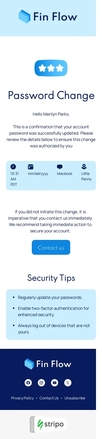 Ensure user security with our "Змінити свій пароль" trigger email template, tailored for the FinTech industry. This template notifies clients when their password has been successfully changed, providing confirmation and reinforcing trust in your platform's security measures. Featuring a professional and clear design, it includes instructions for accessing their accounts and tips for creating strong passwords. This template simplifies communication and sets the standard for effective security notifications. Trust its effectiveness to enhance user confidence, protect sensitive information, and encourage responsible account management within your financial services.