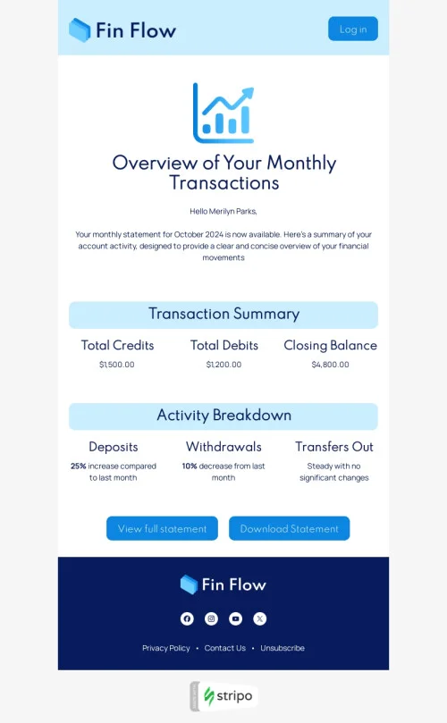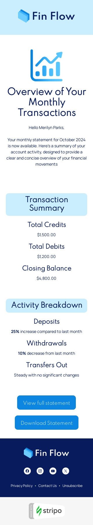 Покращте залучення клієнтів за допомогою нашого "Щомісячного звіту про рахунок" тригерного шаблону електронної пошти, розробленого спеціально для індустрії фінансових технологій. Цей шаблон надає всебічний огляд активності рахунків користувачів, включаючи деталі транзакцій, зміни балансу та ключові показники. Завдяки чіткому та візуально привабливому оформленню, він спрощує складну фінансову інформацію, роблячи її зрозумілою для клієнтів з першого погляду. Цей шаблон встановлює стандарт для ефективної комунікації та своєчасних оновлень. Довіртеся його ефективності для сприяння прозорості, заохочення проактивного фінансового управління та зміцнення відносин з вашими клієнтами.