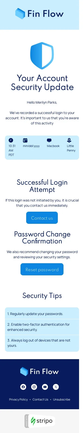 Підвищте безпеку облікового запису за допомогою нашого "Захистіть свій обліковий запис" тригерного шаблону електронної пошти, створеного для фінансових технологій. Цей шаблон інформує користувачів про потенційні вразливості безпеки та заохочує їх вжити термінових заходів для захисту своїх облікових записів. З чітким і професійним оформленням він підкреслює основні заходи безпеки, такі як увімкнення двофакторної аутентифікації та регулярне оновлення паролів. Цей шаблон сприяє ефективній комунікації та встановлює стандарт для сповіщень про безпеку. Довіртеся його здатності наділити користувачів можливістю захистити свої фінансові дані, підвищуючи їхню довіру до зобов'язання вашої платформи щодо безпеки.