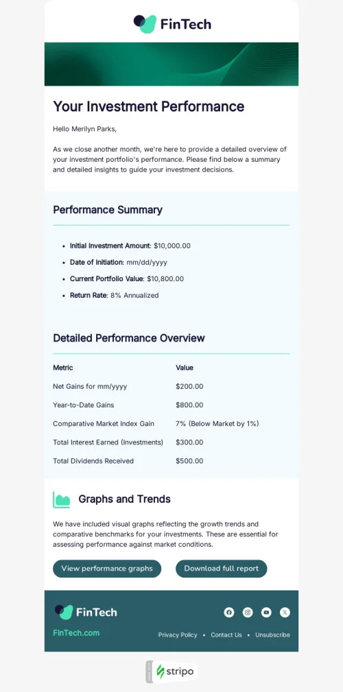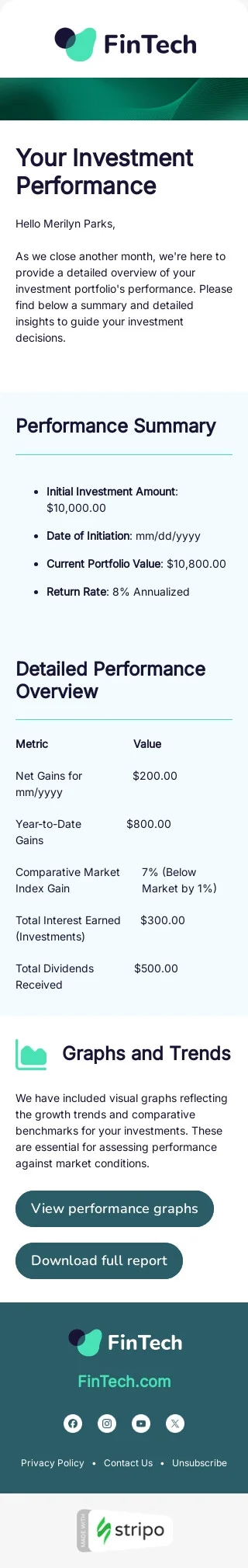 Тримайте своїх клієнтів в курсі з нашим "Вашим шаблоном тригерного електронного листа про інвестиційну ефективність", адаптованим для індустрії FinTech. Цей шаблон надає користувачам персоналізовані інсайти про їхні інвестиційні портфелі, підкреслюючи ключові показники, тенденції та аналітику ефективності. Завдяки чистому та візуально привабливому дизайну, він покращує досвід користувача, роблячи складні фінансові дані легкими для розуміння. Чи то для квартальних оновлень, чи для термінових сповіщень, цей шаблон спрощує комунікацію та встановлює стандарт для інформативної взаємодії в секторі FinTech. Довіртеся його ефективності, щоб зміцнити відносини з клієнтами та сприяти обґрунтованому прийняттю рішень у їхніх інвестиційних подорожах.