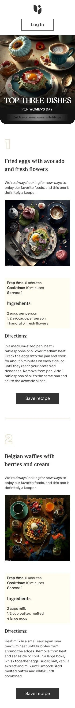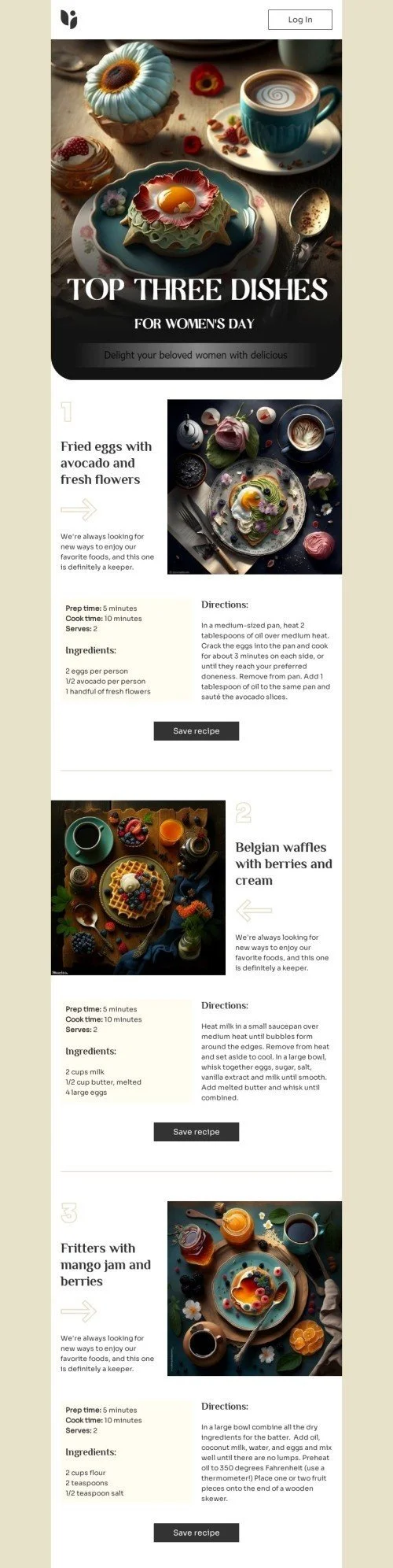 Make Women's Day special with the "Food Recipes by Artificial Intelligence" email template designed specifically for publications and blogging industries. This customizable template features a clean and modern design, with mouth-watering food imagery that will appeal to your foodie subscribers. Use this template to promote your Women's Day recipes or to showcase how AI technology can help create delicious meals. With a strong call-to-action button and a sophisticated design, this email template is sure to engage your subscribers and drive traffic to your website. Celebrate Women's Day with our "Food Recipes by Artificial Intelligence" email template.