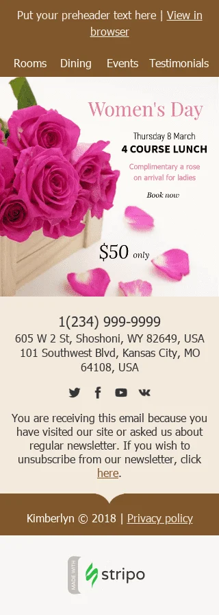 Святкуйте Жіночий день з нашим "Сюрприз для неї" електронним шаблоном, ідеальним для готельної індустрії. Завдяки його елегантному та жіночному дизайну, ви можете запропонувати своїм гостям особливий подарунок на свято або просувати свої пакети та акції до Жіночого дня. Від спа-процедур до романтичних вікендів, цей шаблон допоможе вам висловити вашу вдячність жінкам у вашому житті та створити незабутню кампанію для ваших гостей. Завдяки налаштовуваним елементам та сильним закликам до дії, ви можете максимально використати святковий сезон і залучити нових клієнтів. Покажіть своїм гостям, як ви їх цінуєте, і створіть незабутнє враження від Жіночого дня у вашому готелі.